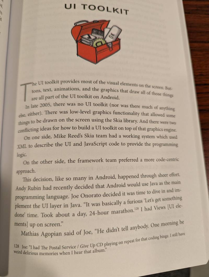 The result? The entire View UI system—you know, the foundation of Android UI for over a decade—was written by a single developer in a single day. And since there was no alternative, everyone just... went with it.